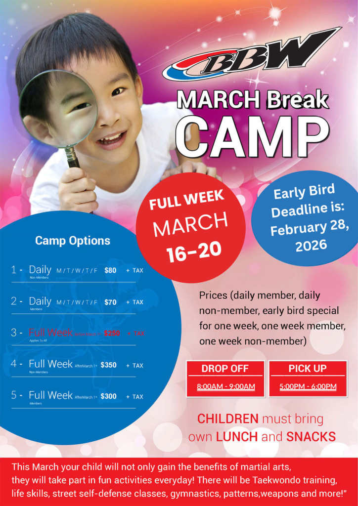 This March your child will not only gain the benefits of martial arts, they will take part in fun activities everyday! There will be Taekwondo training, bouncy castles, life skills, street self-defence classes, gymnastics, patterns, weapons and more!
